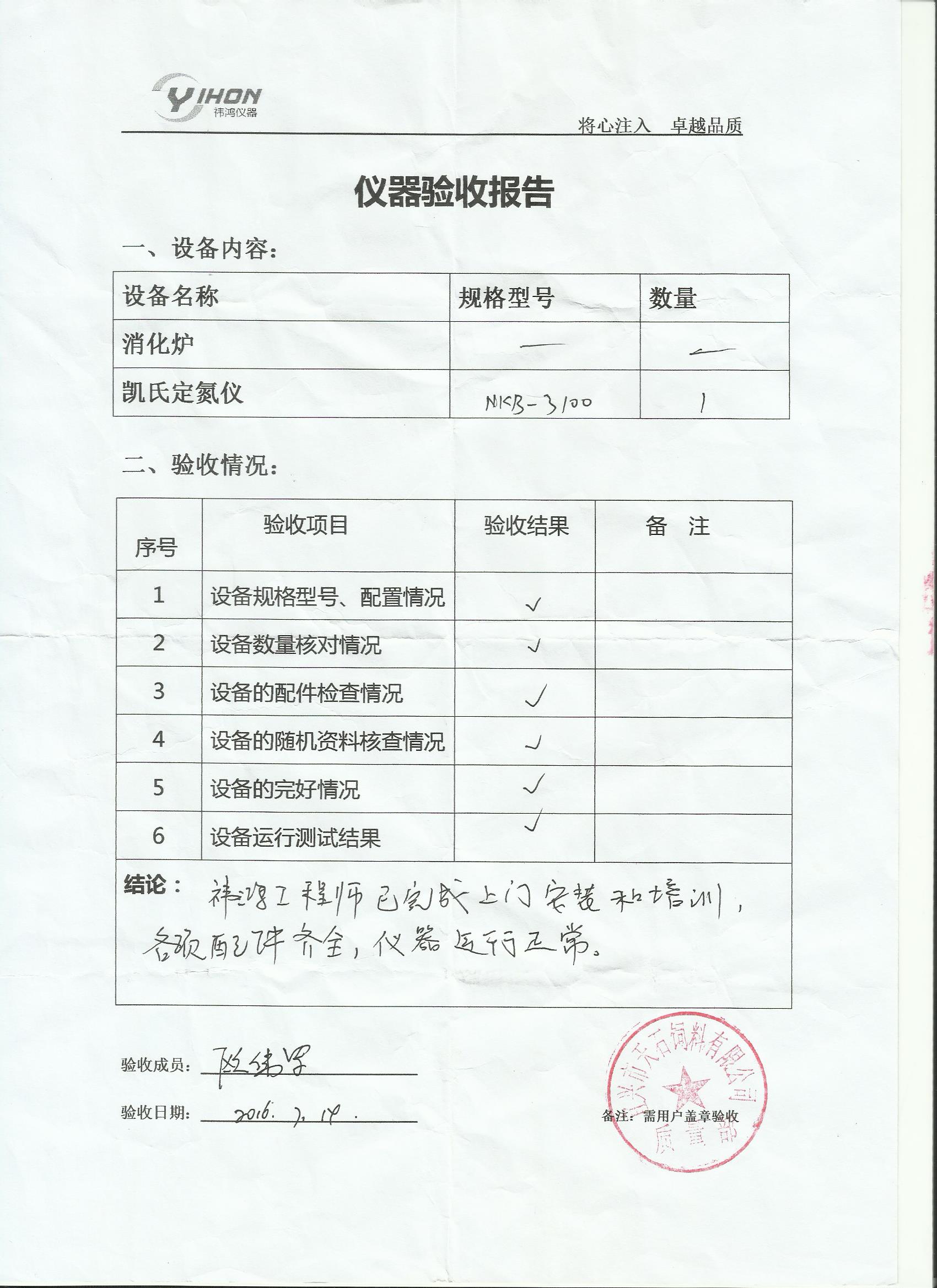 安装调试现场 验收报告