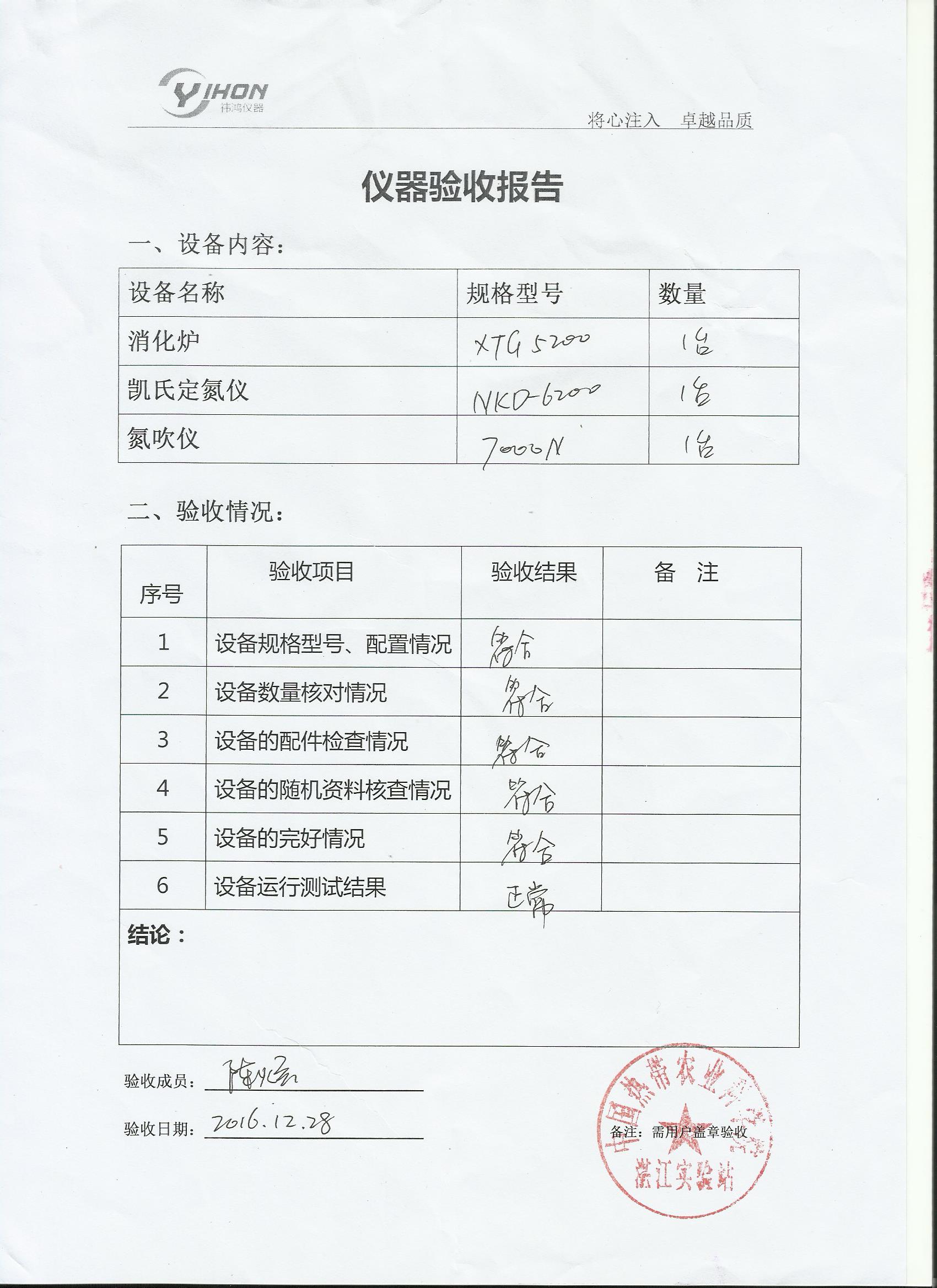 11月中旬中国热带农业科学院湛江实验站选择了与上海祎鸿分析仪器有限公司合作。采购我司NKD6200电位法凯氏定氮仪和XTG5200远红外消解仪,广东湛江农林试验站老师在选择定氮仪特别慎重,经过多次技术交流,特别对电位滴定系统和红外消解仪技术感兴趣,反复多次试验数据认证以及人性化友好操作界面深深的打动了老师,以及完善的销售售前支持后售后服务解决方案,都得到了老师的认可。最终达成合作,我们将一如既往的服务好用户,让用户满意。