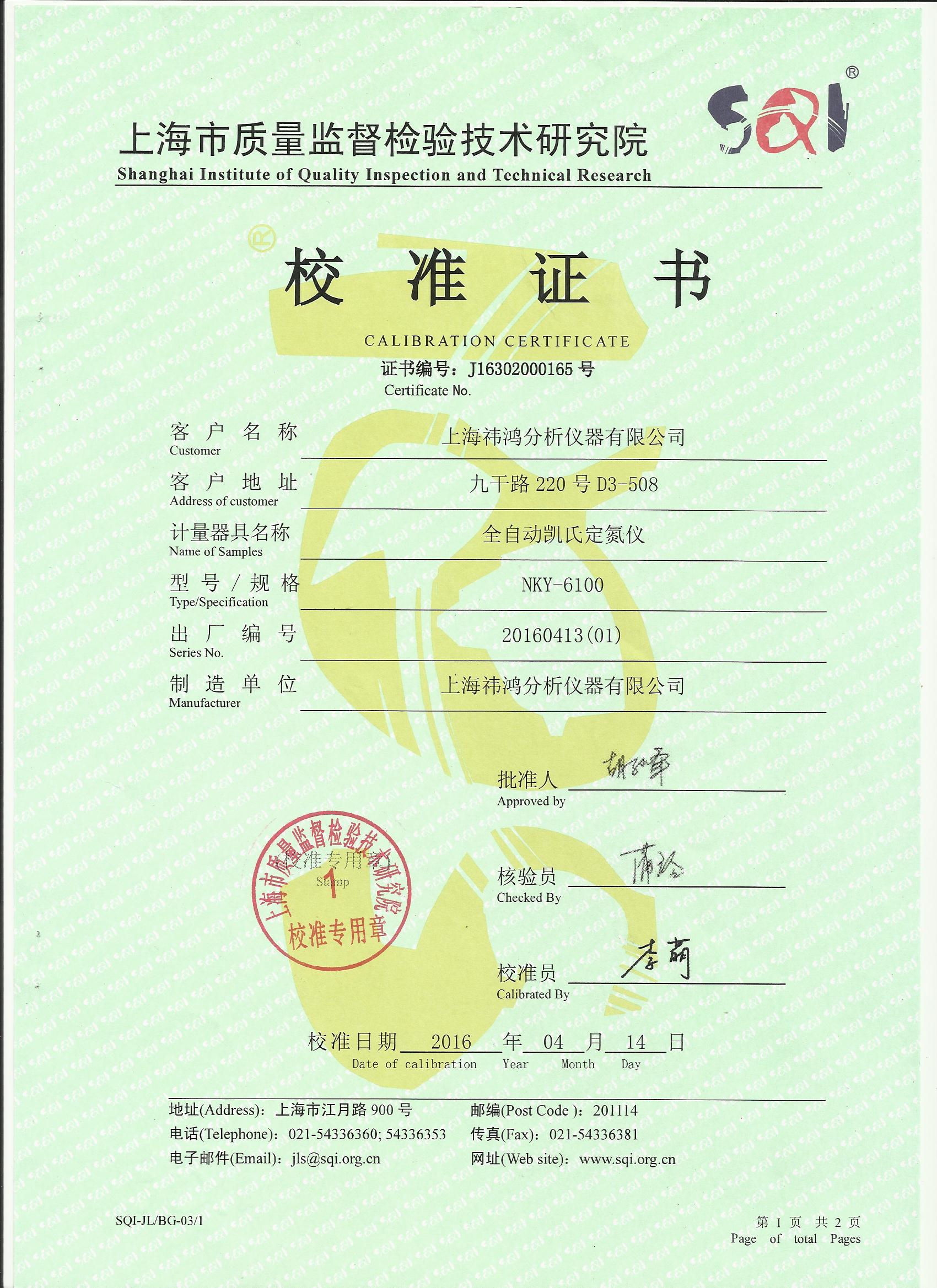阳光明媚的5月,上海祎鸿分析仪器有限公司自主研发生产的全自动凯氏定氮仪NKY6100系列获得了上海市质量监督检验技术研究院颁发的计量校准证书。