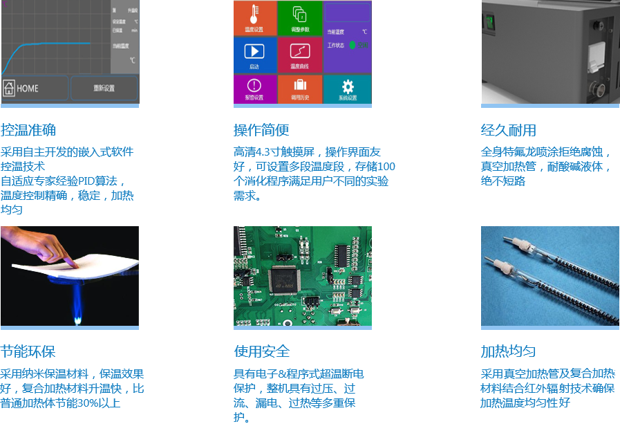 XTG5080红外消解仪采用电热丝复合真空加热技术,升温效率高,温度均匀性好。采用行业领先的纳米云隔热材料,热效率高,节能环保。更具有4.3寸高清LCD触摸屏操控界面,简单易懂,并具实时显示温度曲线功能,摒弃了以往温控表头繁琐的操作。
